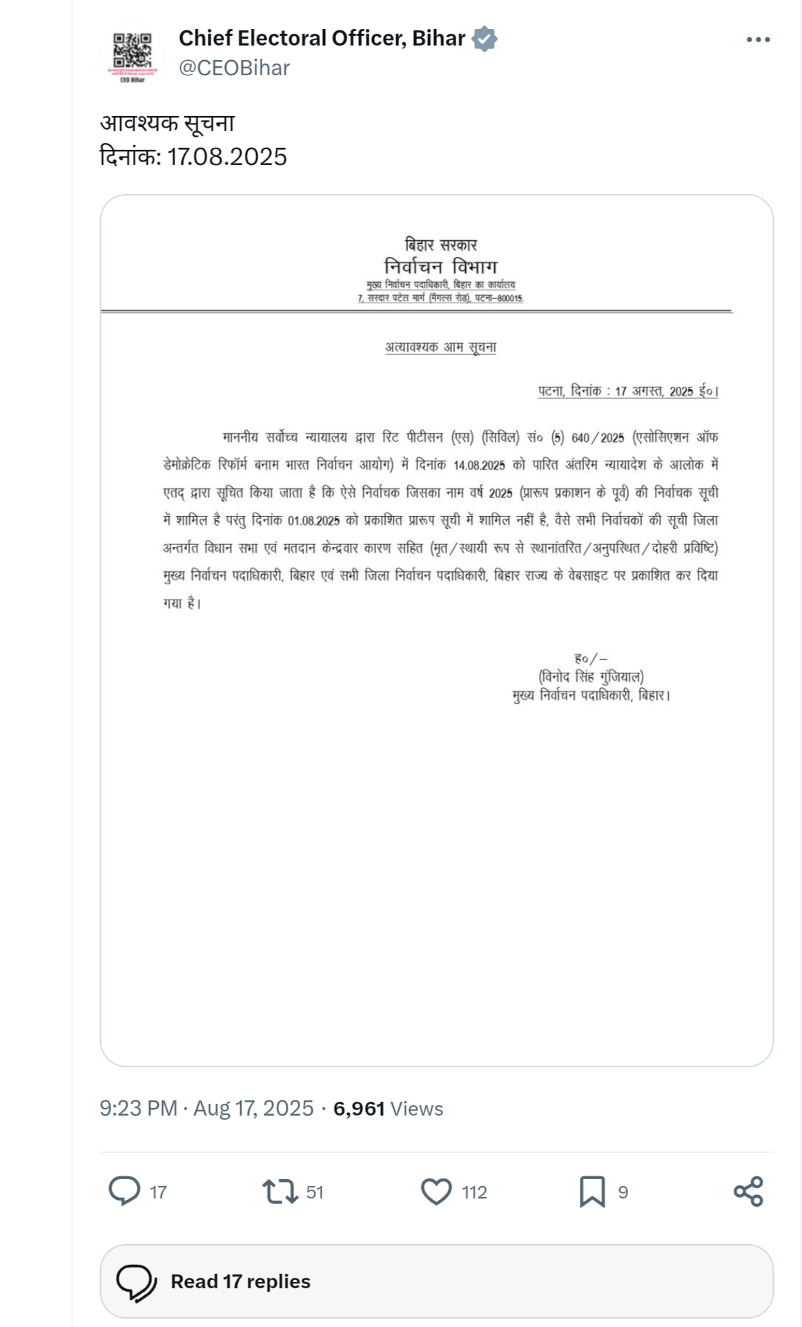 बिहार में चुनाव से पहले SIR यानी विशेष गहन पुनरीक्षण के बाद मतदाता सूची में 65 लाख मतदाताओं के नाम कटने से राजनीतिक हलकों में हलचल मच गई.सूची जारी करने का ये कदम सुप्रीम कोर्ट के 14 अगस्त के आदेश के तहत उठाया गया है, इसमें उन मतदाताओं के नाम शामिल हैं, जिनके नाम SIR ड्राफ्ट लिस्ट से हटाए गए थे. ये सूची आयोग की आधिकारिक वेबसाइट पर सार्वजनिक कर दी गई है, ताकि सभी मतदाता आसानी से अपनी जानकारी की पुष्टि कर सकें.मतदाताओं की सुविधा के लिए चुनाव आयोग ने बिहार वेबसाइट पर नया लिंक भी सक्रिय कर दिया है, जिससे सभी लोग आसानी से अपनी सूची जांच सकते हैं.